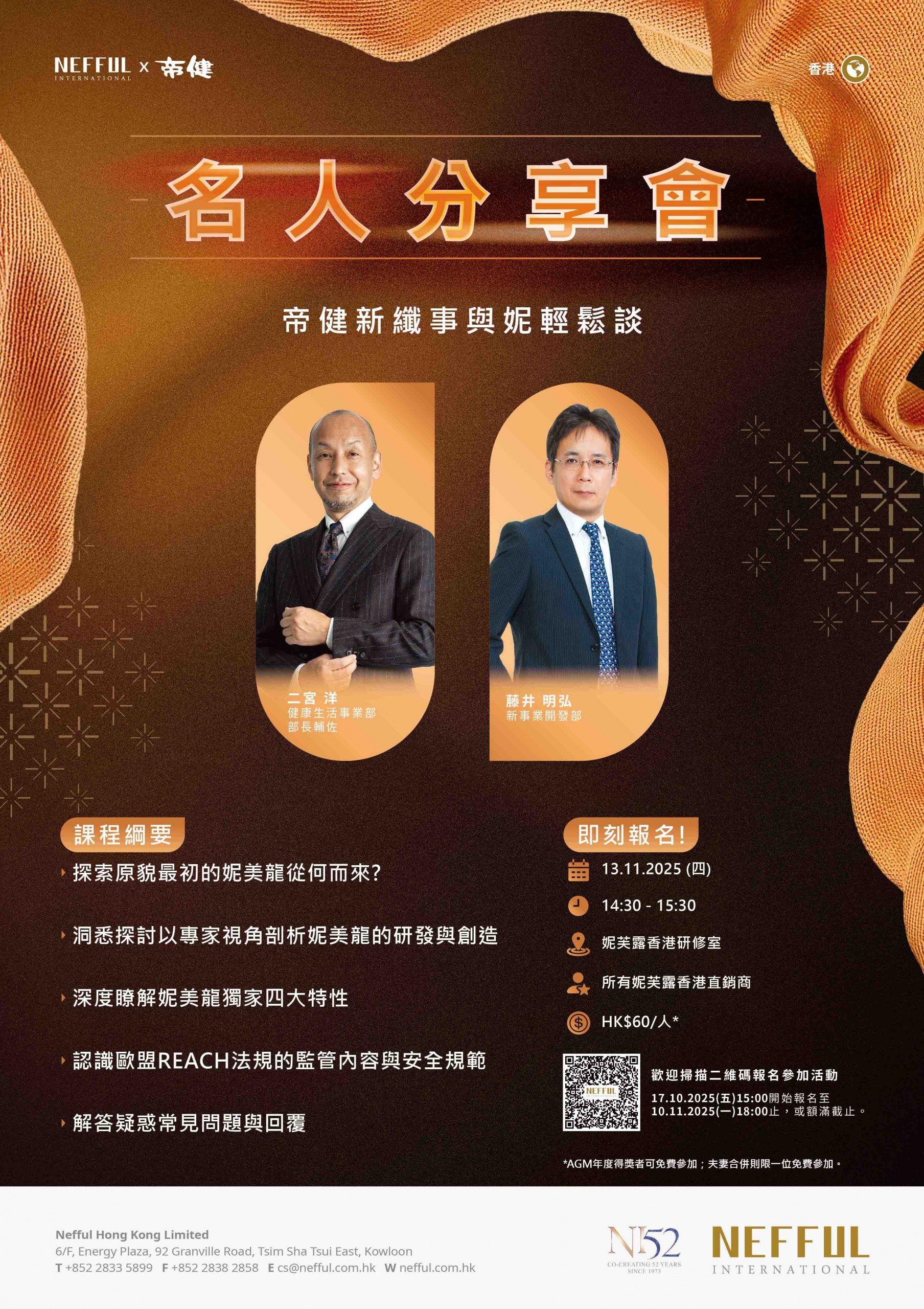 誠摯邀請您參加 「新纖事與妮輕鬆談」,與帝健 二宮 洋 部長輔佐 及藤井 明弘 先生🧑💼