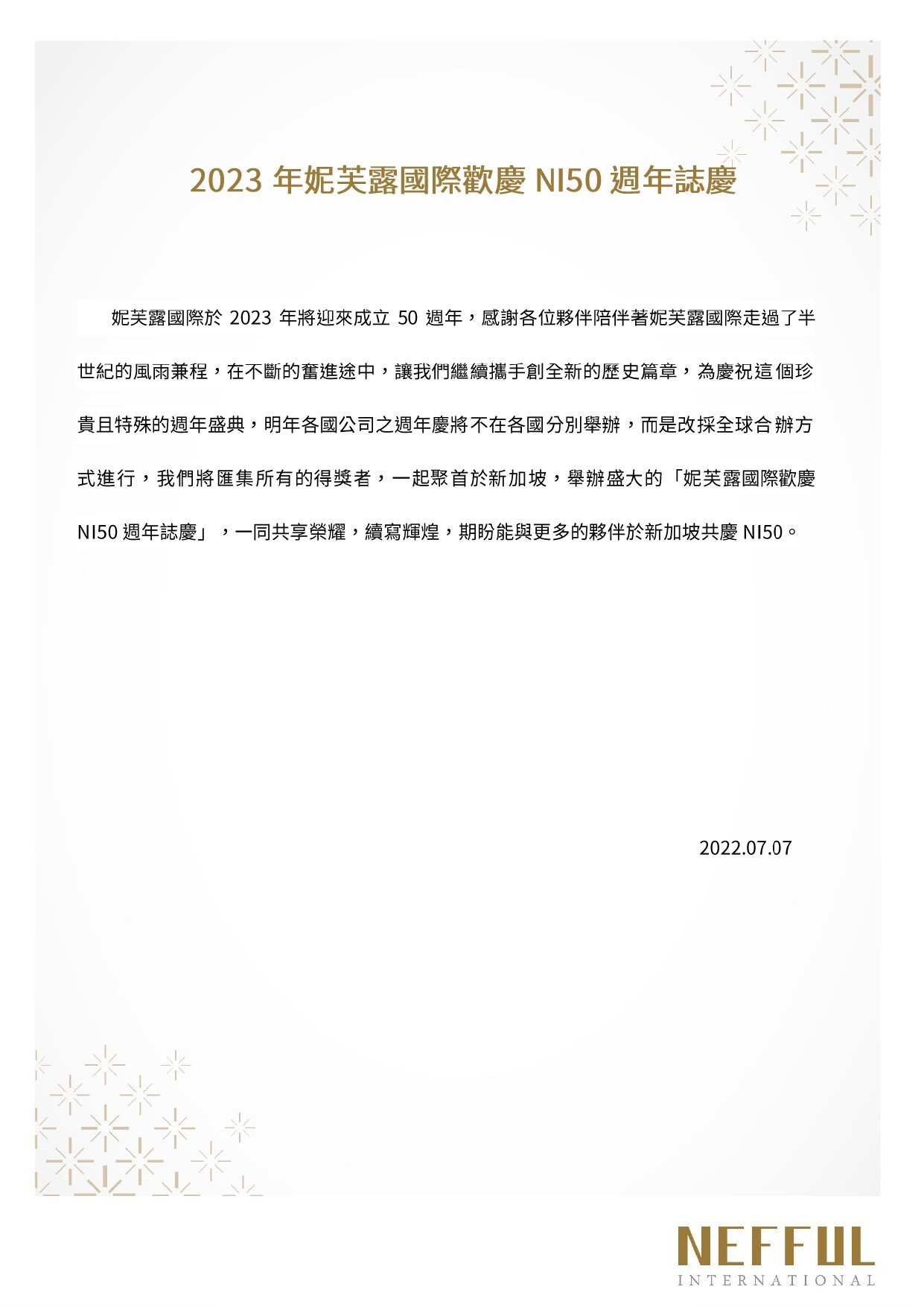 2023年妮芙露國際歡慶 NI50 週年誌慶2022年7月7日 https://www.nefful.com.hk/wp-content/uploads/2023/08/LogoText_.png 0 0 Administrator https://www.nefful.com.hk/wp-content/uploads/2023/08/LogoText_.png Administrator2022-07-07 17:02:022022-07-07 21:46:472023年妮芙露國際歡慶 NI50 週年誌慶