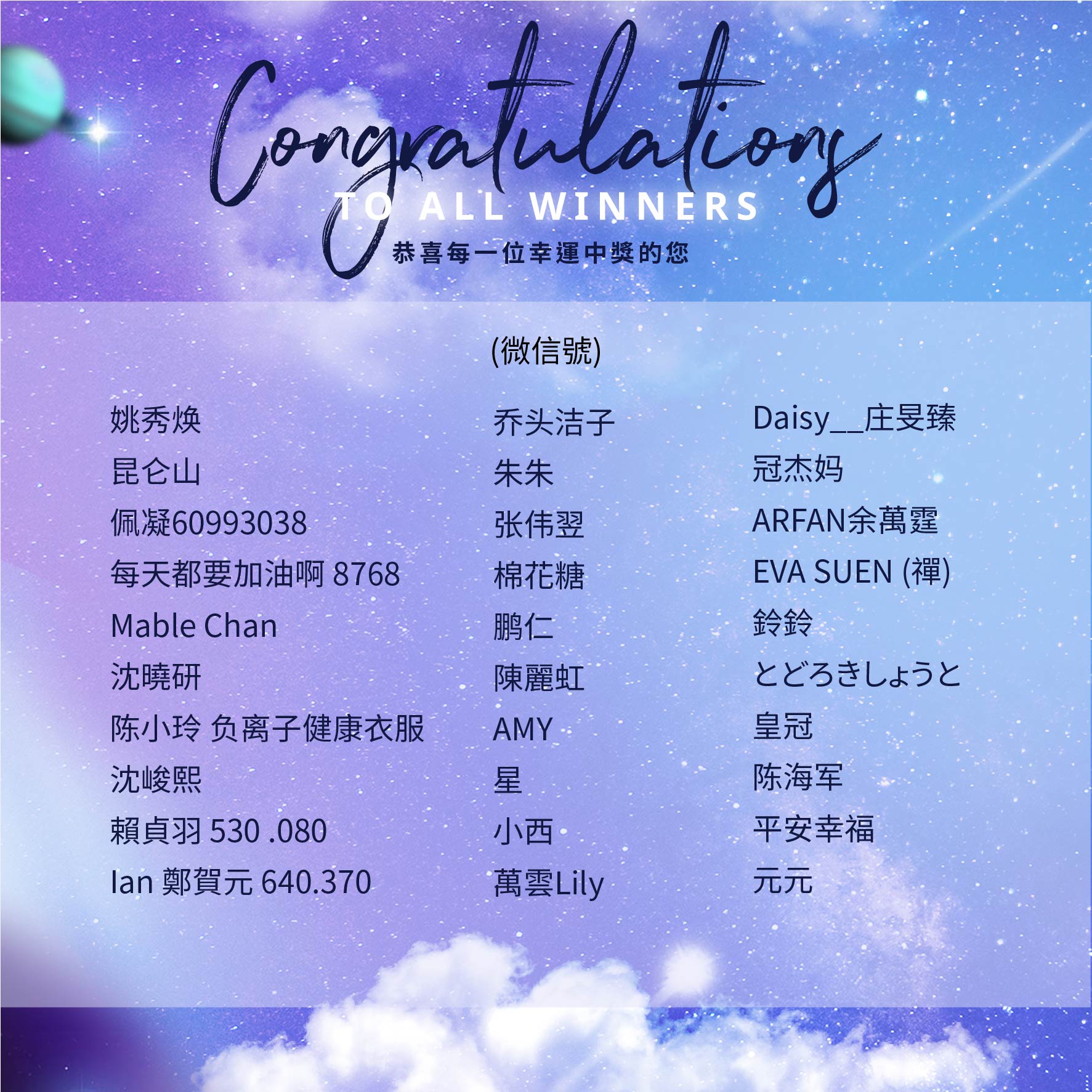 感謝您的參與,再次恭喜以上幸運得獎者!注:得獎者名單以FB帳號及微信帳號為依據
